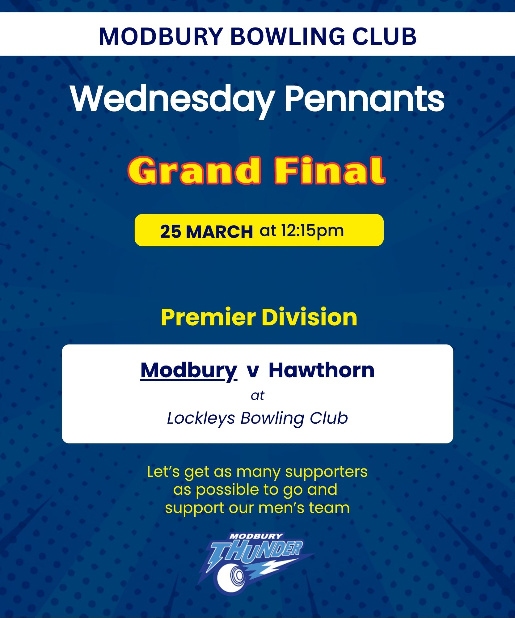 Go and support our Men’s Pennant team playing in the Grand Final on Wednesday 25th March. Details on the flyer.