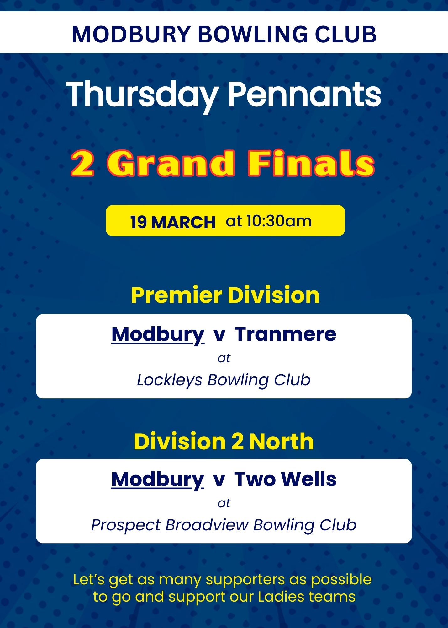Go and support our 2 Ladies Pennant teams playing in Grand Finals on 19th March. Details on the flyer.